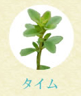 タイムとは「力」を意味し、この香りをかぐと力がわくと。。。古くから勇気のシンボルとされ、ローマ時代にはタイムを浸した水を兵士たちが浴びたと言われています。タイムは独特の香りと苦味のある香辛料、石鹸などの香料としても用いられます。